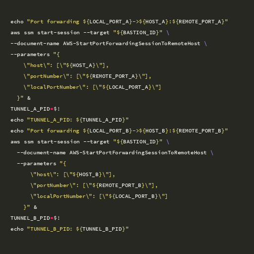 echo "Port forwarding ${LOCAL_PORT_A}->${HOST_A}:${REMOTE_PORT_A} through bastion..."